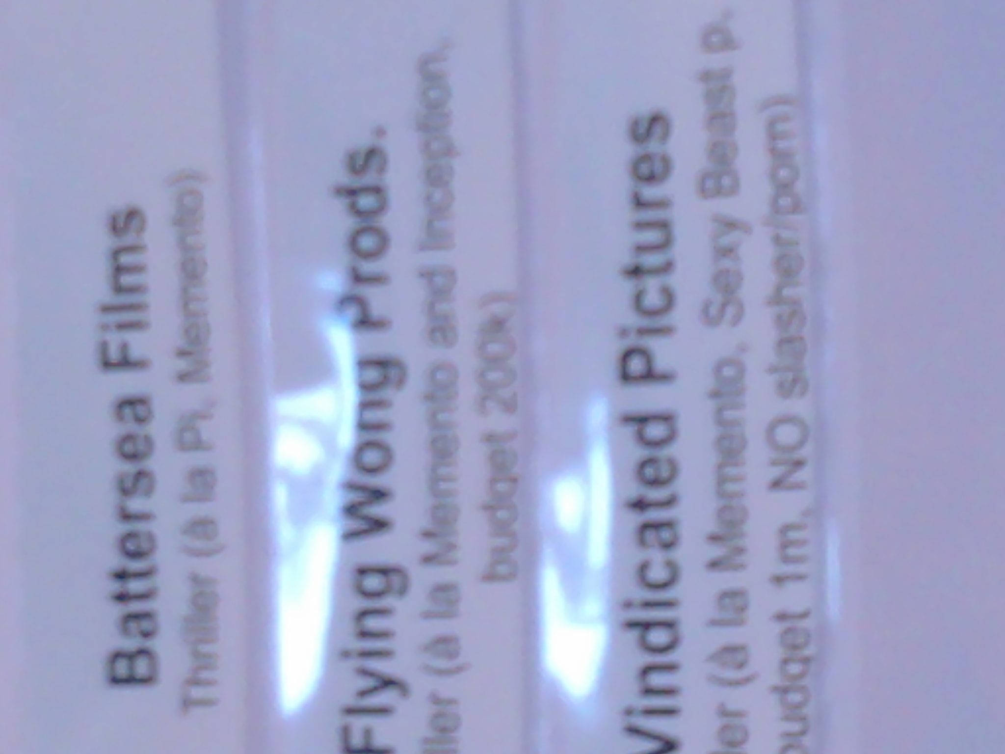 Back again from a whirlwind trip out to Burbank for a screenplay pitch fest. I had to share the funniest part about InkTip. Some 300 companies came to hear pitches — fabulous. They have great names — like Flying Wong Productions, Twisted Pictures and No Suck Comedy, Inc. It’s just that some of them ask for ridiculously low-budget features. For example, in this line you could pitch to three companies at once.