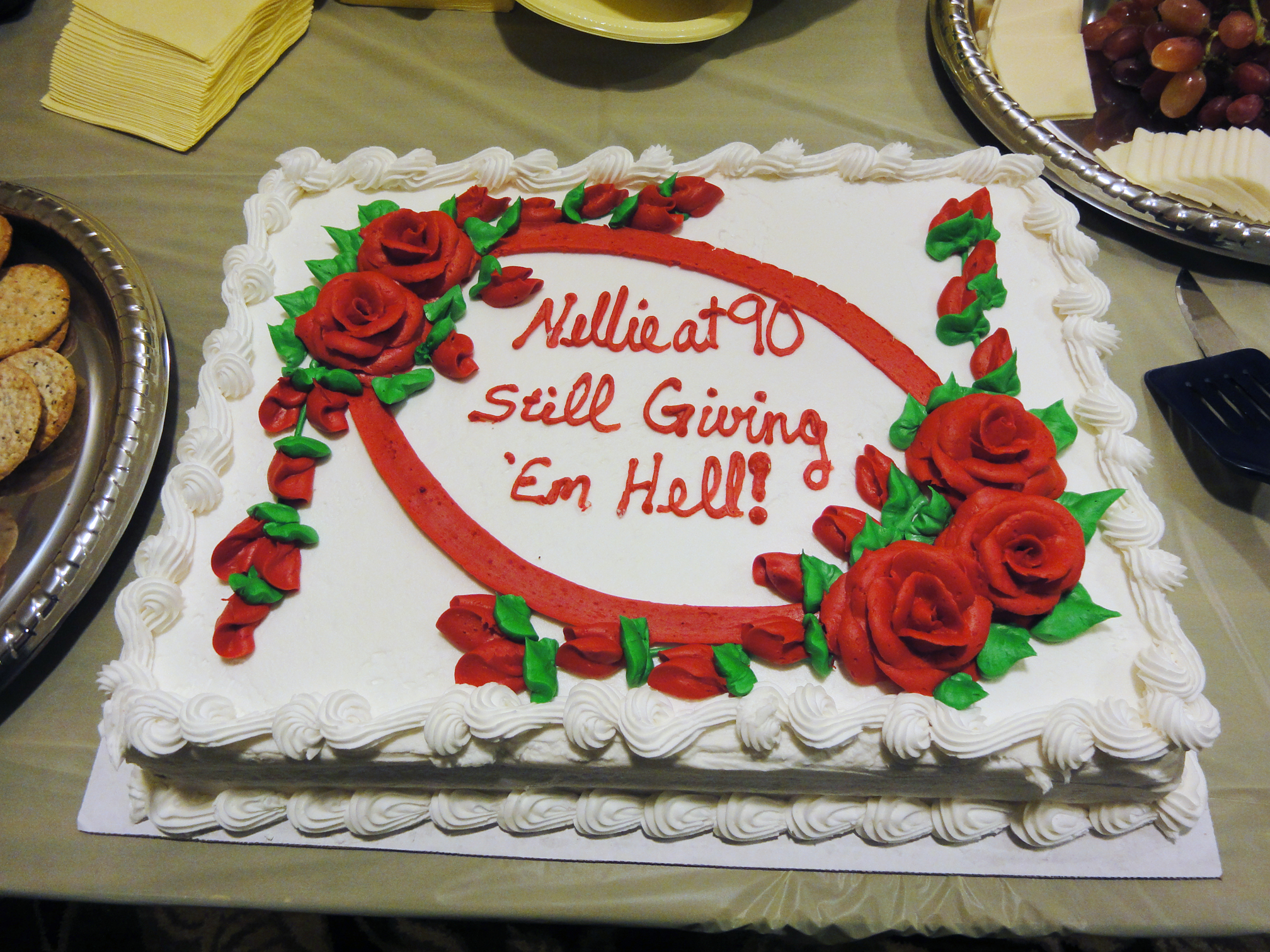 I think my aunt was stunned when I piped up with an idea for the decorative lettering on the massive sheet cake we were ordering. Without hesitation, I filled out the line on the form for the “personal message.” A day later we picked up a flowered, frosted, manhole-cover sized cake that read: “Nellie at 90. Still giving ‘em hell.”
